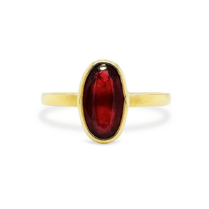 Gold ring with a red gemstone on a person&