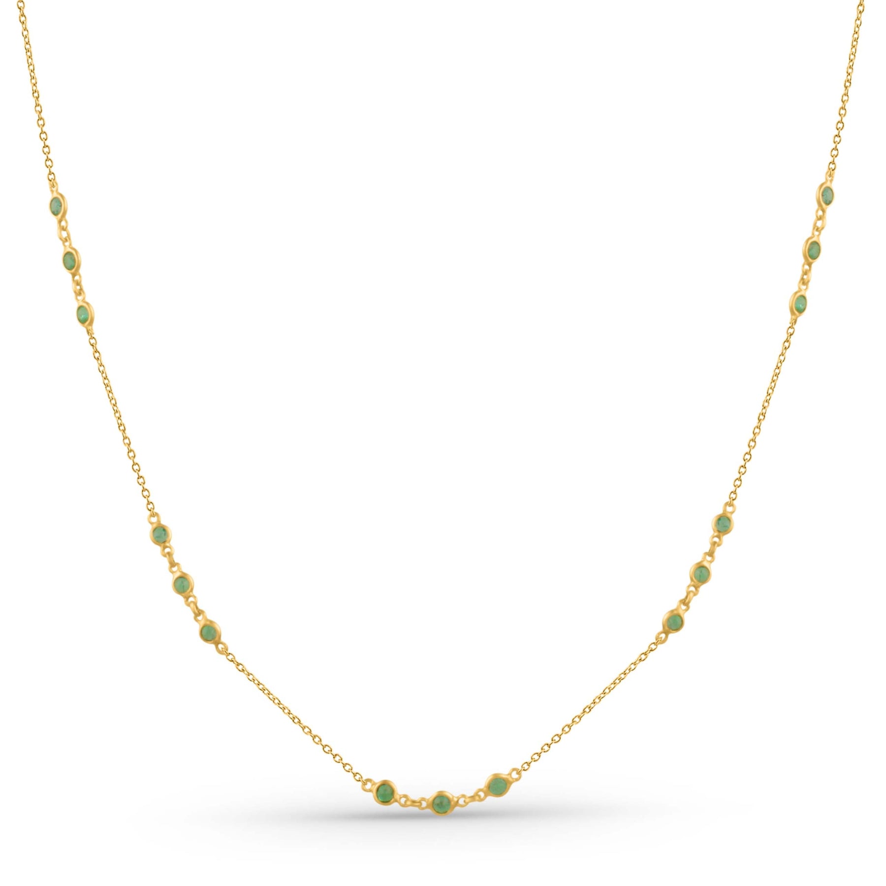 Crafted with timeless grace, this 18K yellow gold necklace from Tresor Collection embodies modern minimalism and handcrafted elegance. A refined arrangement of 3.66 cts of cabochon-cut round emeralds glimmers softly along a fine gold chain, echoing the serene beauty of nature.