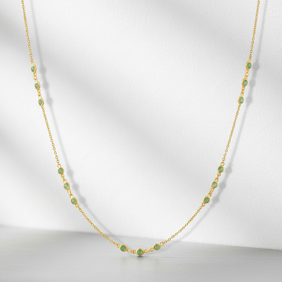 Gold necklace with green gemstones on a white background Close-up of 18K gold emerald necklace – handcrafted fine jewelry from Tresor Collection boutique