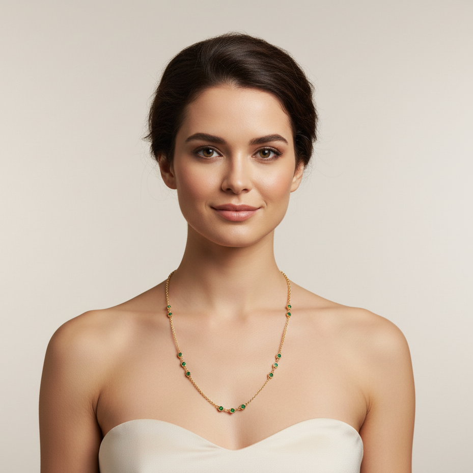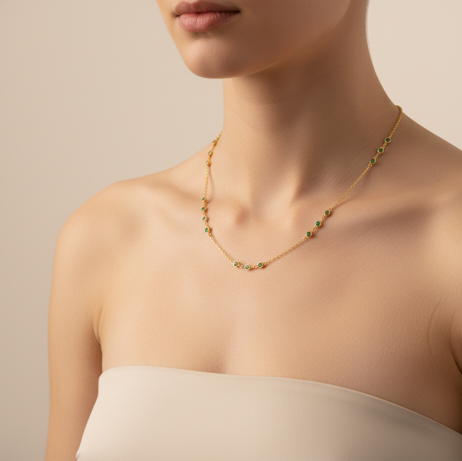 Emerald gold necklace styled for festive and everyday elegance – luxury handcrafted jewelry from Tresor Collection