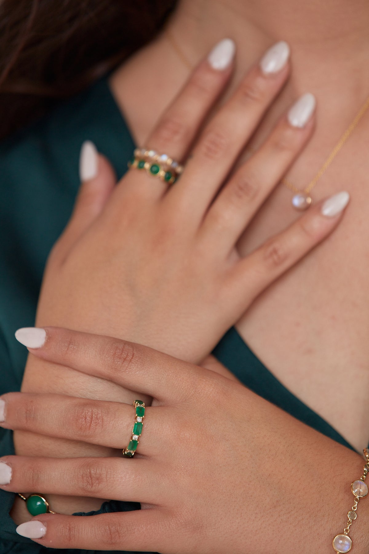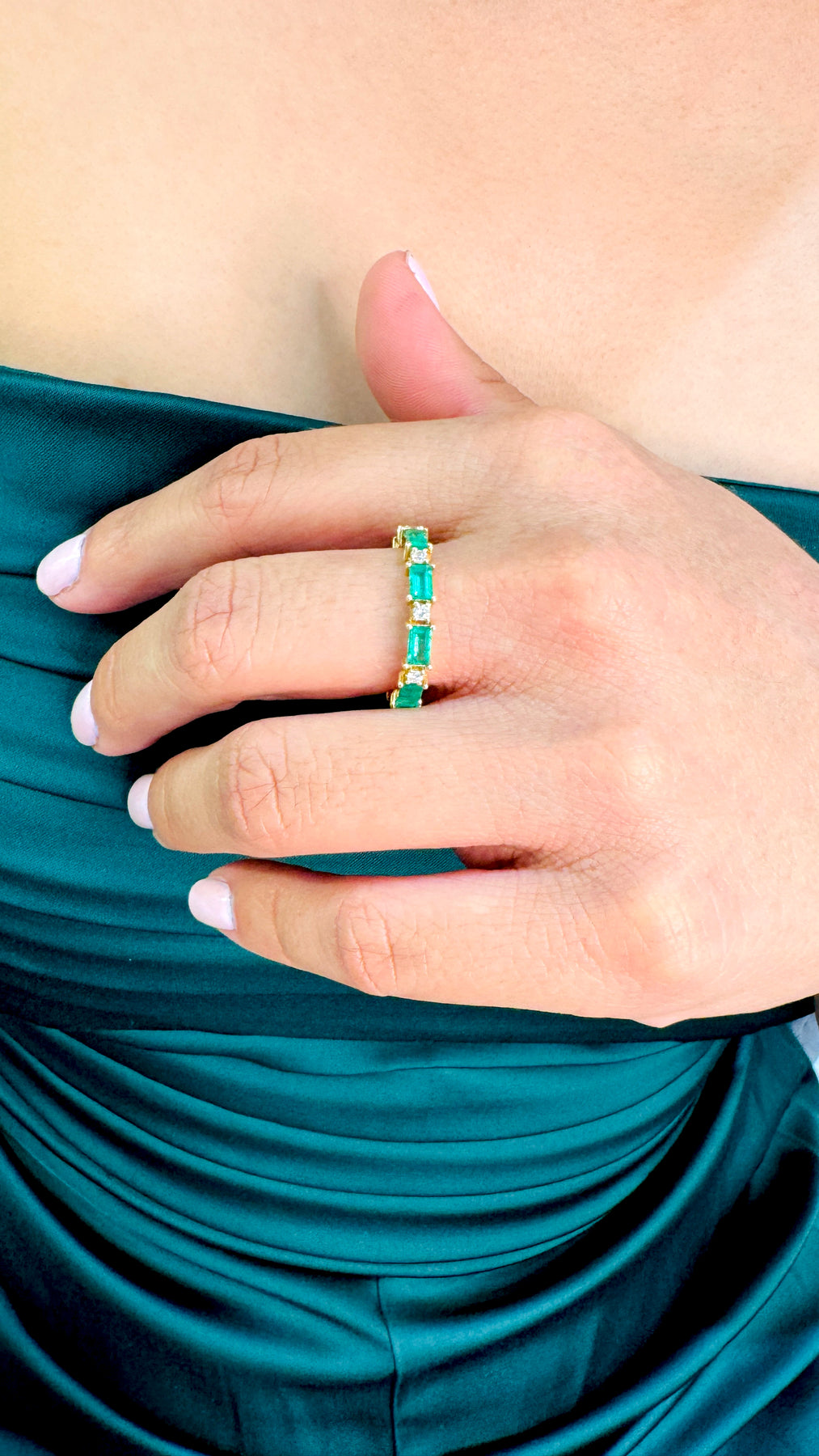 Emerald Rectangle And Diamond Ring In 18K Yellow Gold - Tresor Collection Model wearing emerald eternity band ring on hands – premium luxury jewelry styling