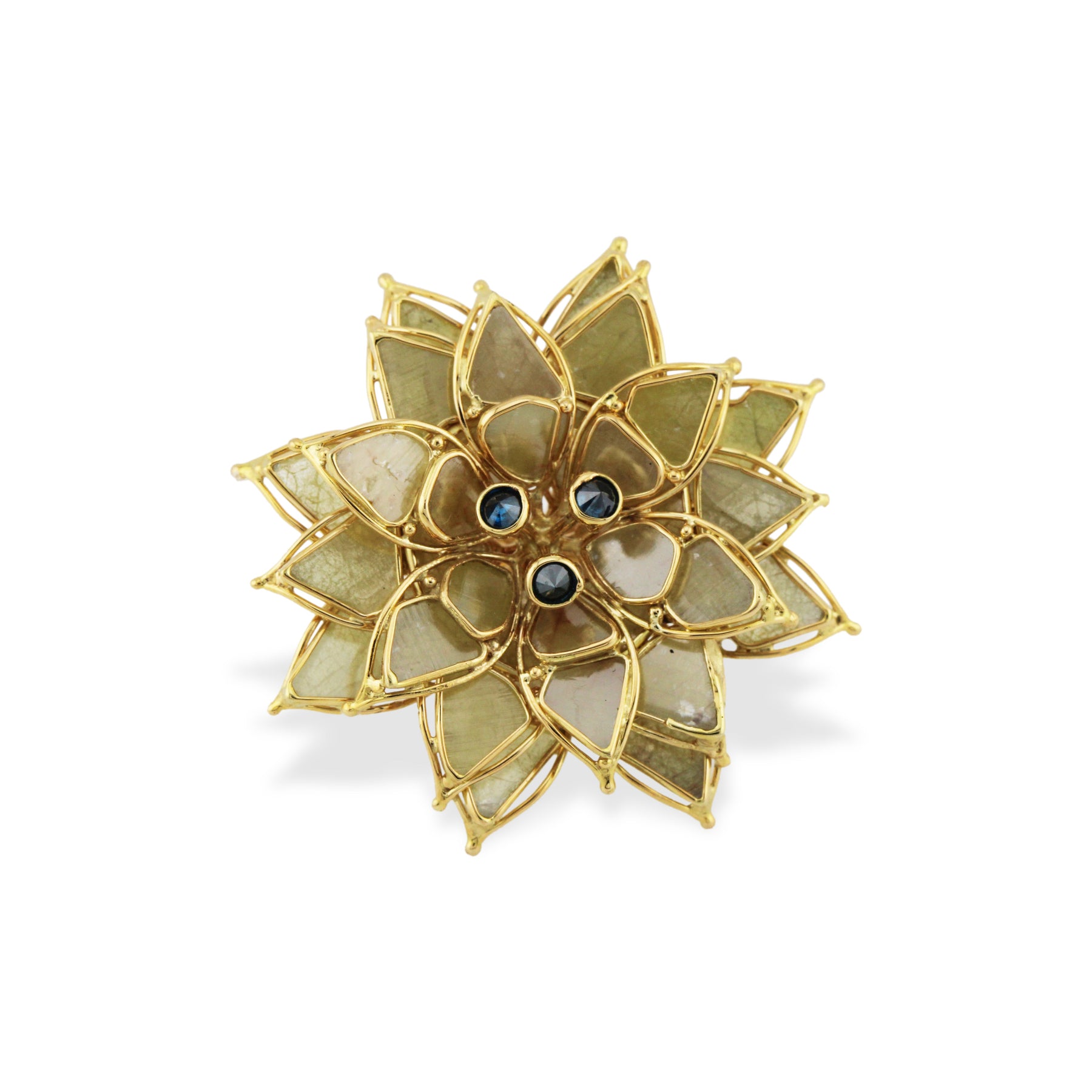 Top view close-up of floral ring – handcrafted 18K yellow gold with blue stone accents by Tresor Collection