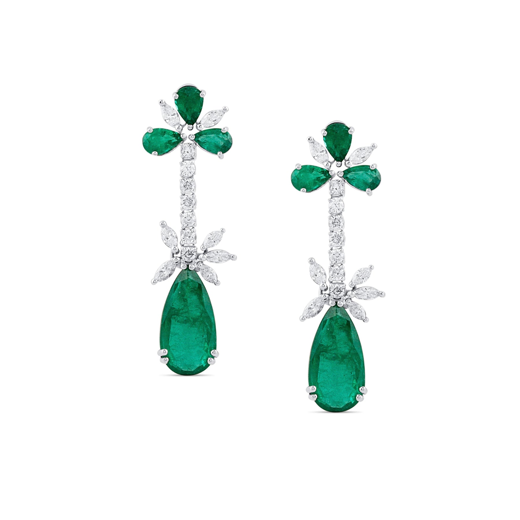 18K White Gold Emerald & Diamond Pear Shape Earrings by Tresor Collection Emerald and diamond floral drop earrings in 18K white gold – luxury handcrafted jewelry by Tresor Collection