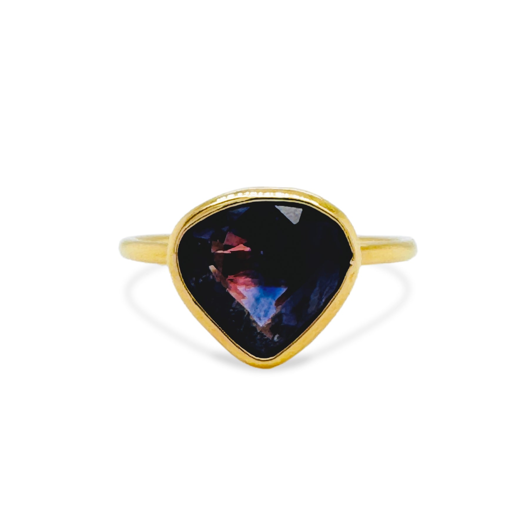 Gold ring with a dark stone featuring colorful nebula design on a white background 18K gold blue sapphire ring flatlay – luxury fine jewelry by Tresor Collection
