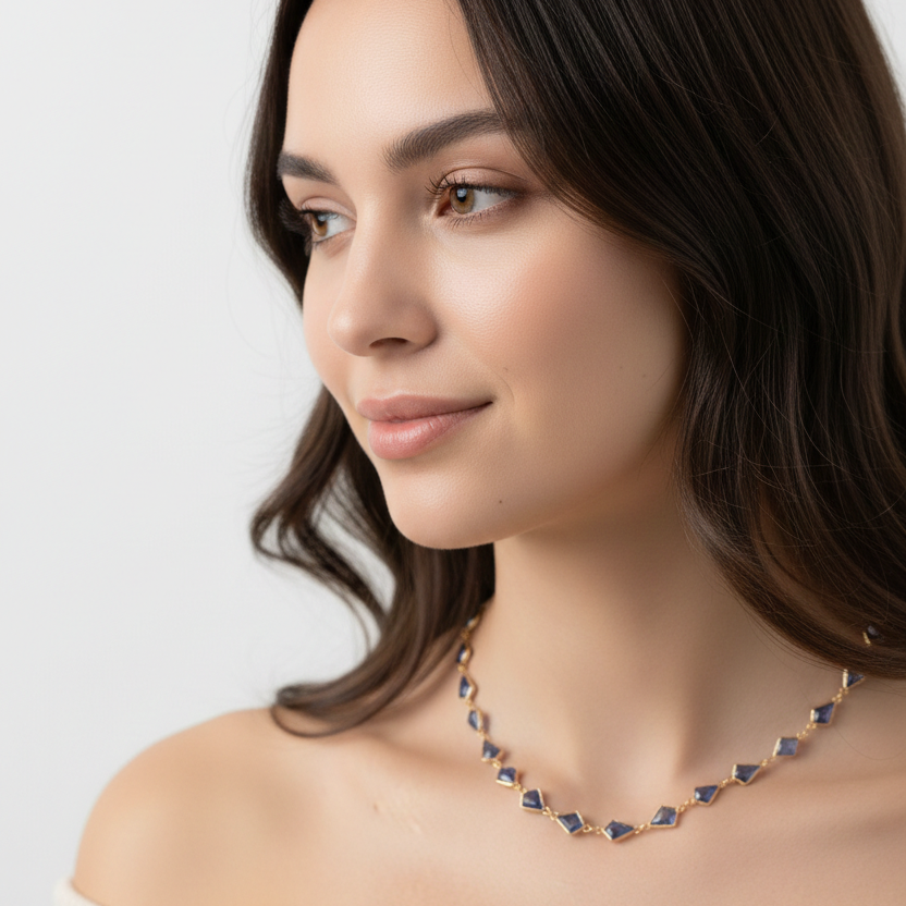Woman wearing a delicate necklace against a plain background Woman wearing blue sapphire and gold link necklace, minimalist everyday jewelry