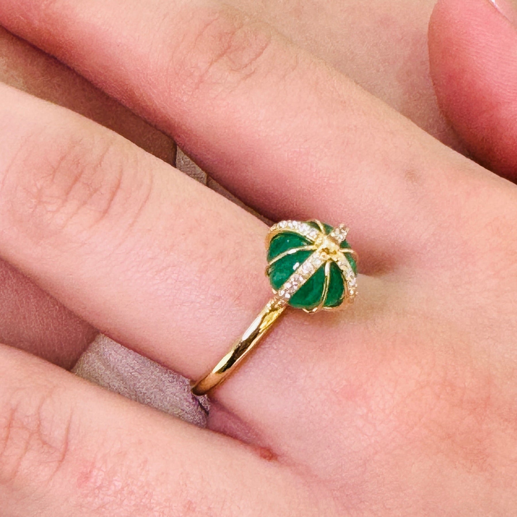 Detailed view of emerald and diamond beads ring design in 18k yellow gold