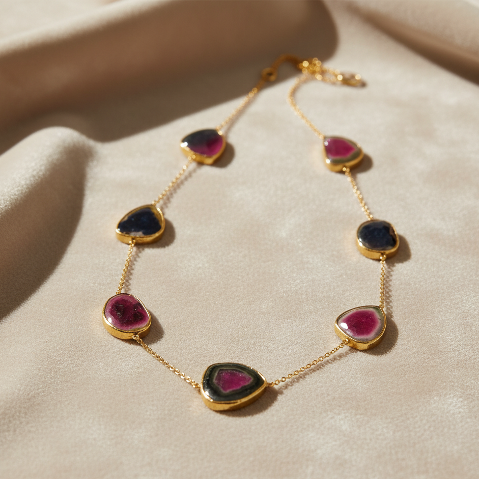 Necklace with gemstone pendants on a beige fabric background Close-up of 18K gold Watermelon Tourmaline necklace – handcrafted fine jewelry from Tresor Collection boutique