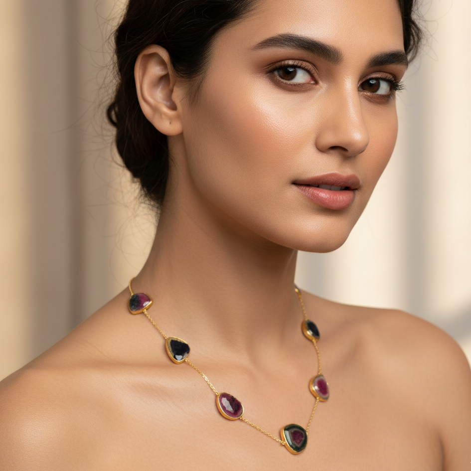 Woman wearing a gold necklace with gemstones against a neutral background Elegant Watermelon Tourmaline necklace on model – designer gold jewelry for women by Tresor Collection